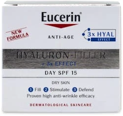 - Eucerin Hyaluron-Filler SPF15 Dry Skin Day Cream fills, stimulates, protects, and defends your skin