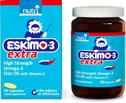 Eskimo®-3 Extra is a pure and stable omega-3 fish oil providing high levels of fatty acids EPA and DHA in their optimal 3:2 ratio. Each capsule typically provides 300mg of EPA and 200mg of DHA. Omega-3 fatty acids have been well studied, with EPA and DHA contributing to the normal function of the heart, and DHA supporting normal brain function and vision.